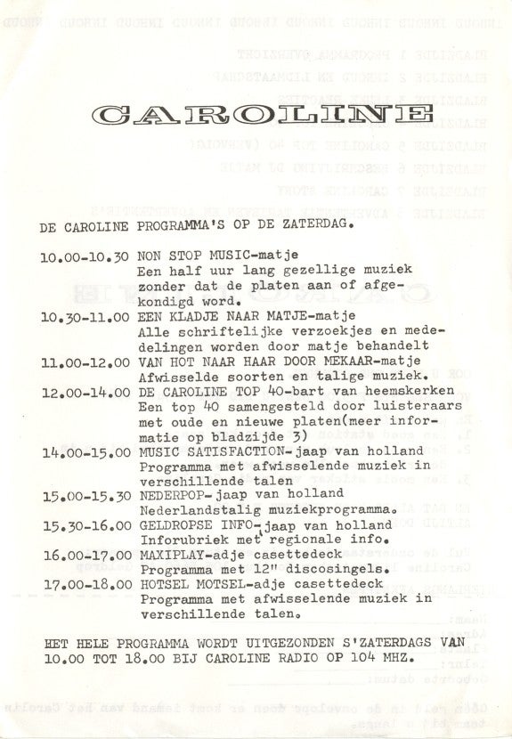 Het Caroline team bestond in deze periode uit, Bart van Heemskerken, Joost den Draaier, Janus Bontebal, Jan wouters, Jantje vingerhoed. De uitzendingen waren beperkt tot 1 uur per dag en op zaterdag en zondag elk 2 uur. Uit die periode zijn ook de Q.S.L. kaarten en stickers bewaard gebleven.