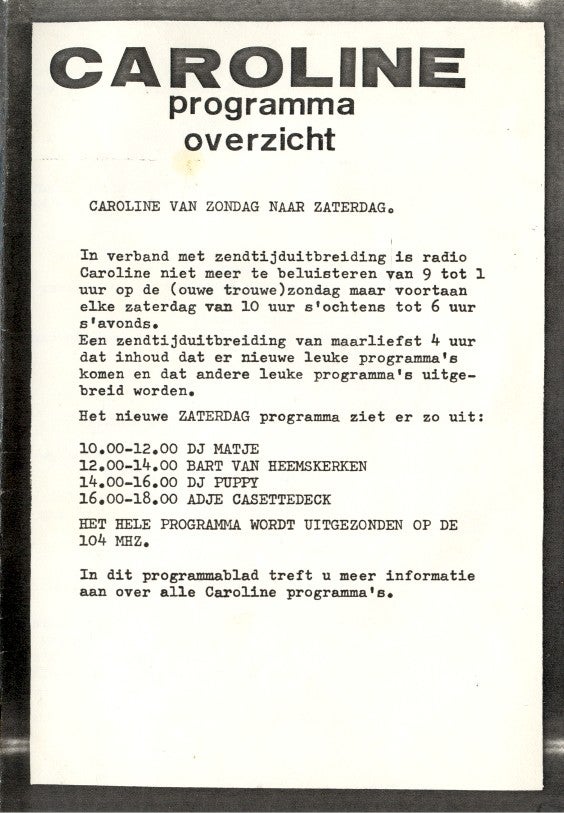 Adje Cassettedeck neemt Radio Caroline over. De stickers maken plaats voor een programmablaadjes die bij muziekhandel Foole en de Heikrekel te verkrijgen zijn. Leden krijgen hem thuis bezorgd. Radio caroline heeft ook een eigen Drive In Discotheek. Deze drive in discotheek wordt er door Mario en Bart opgezet. Een samenwerking met de drive in show van Robert van der Loo en Wil Luikinga levert een tweetal nieuwe radio deejays op. Andere foto's van de drive in discotheek.